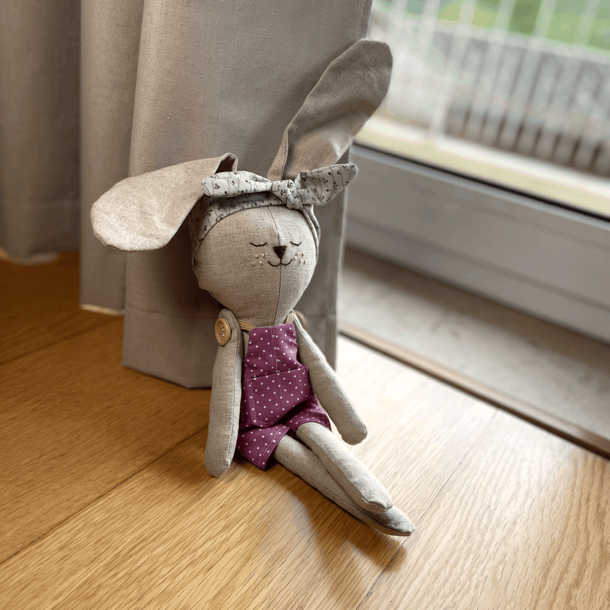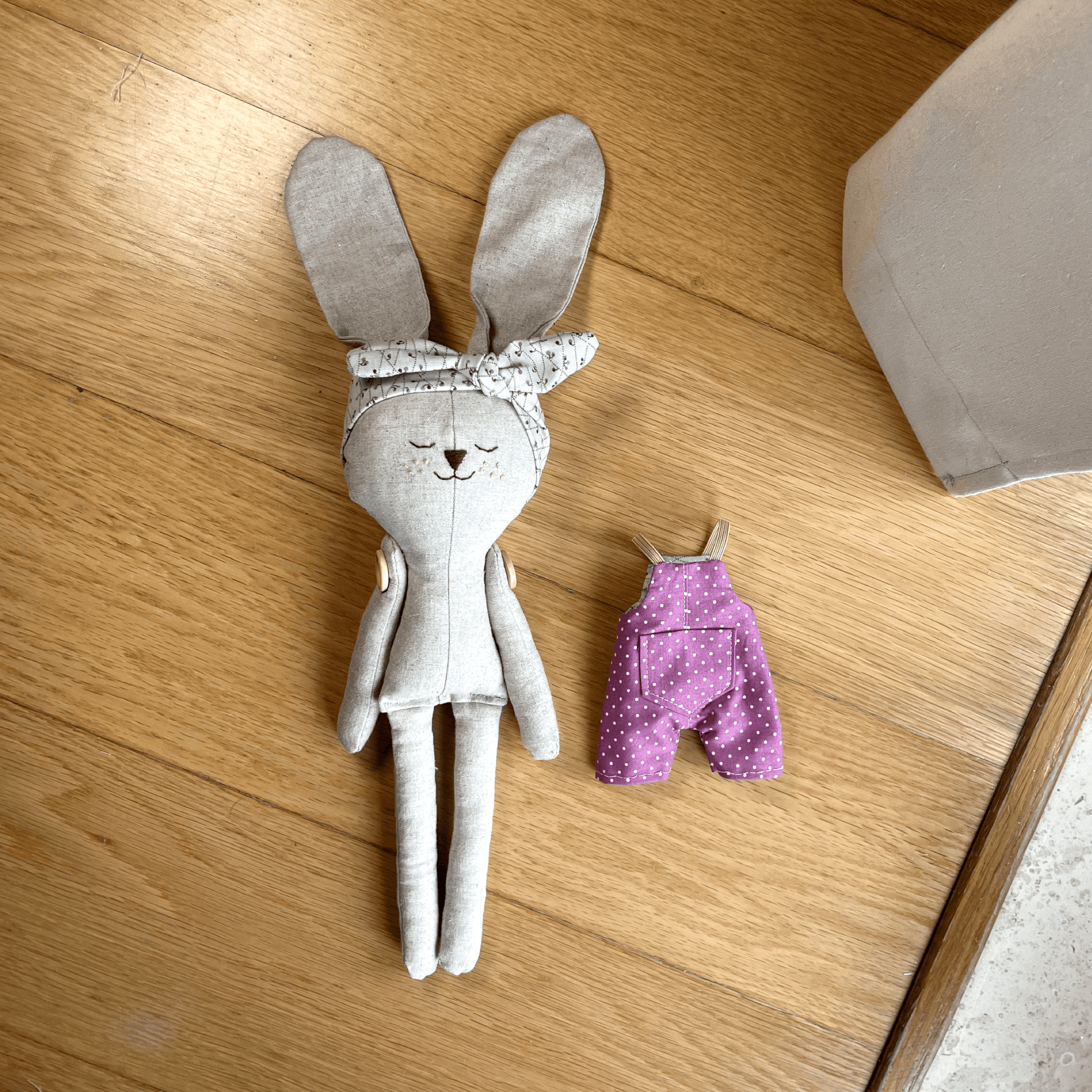 O seu corpo é feito com tecido 50% linho 50% algodão e o seu enchimento em poliester, com roupas feitas em algodão e pormenores bordados à mão.