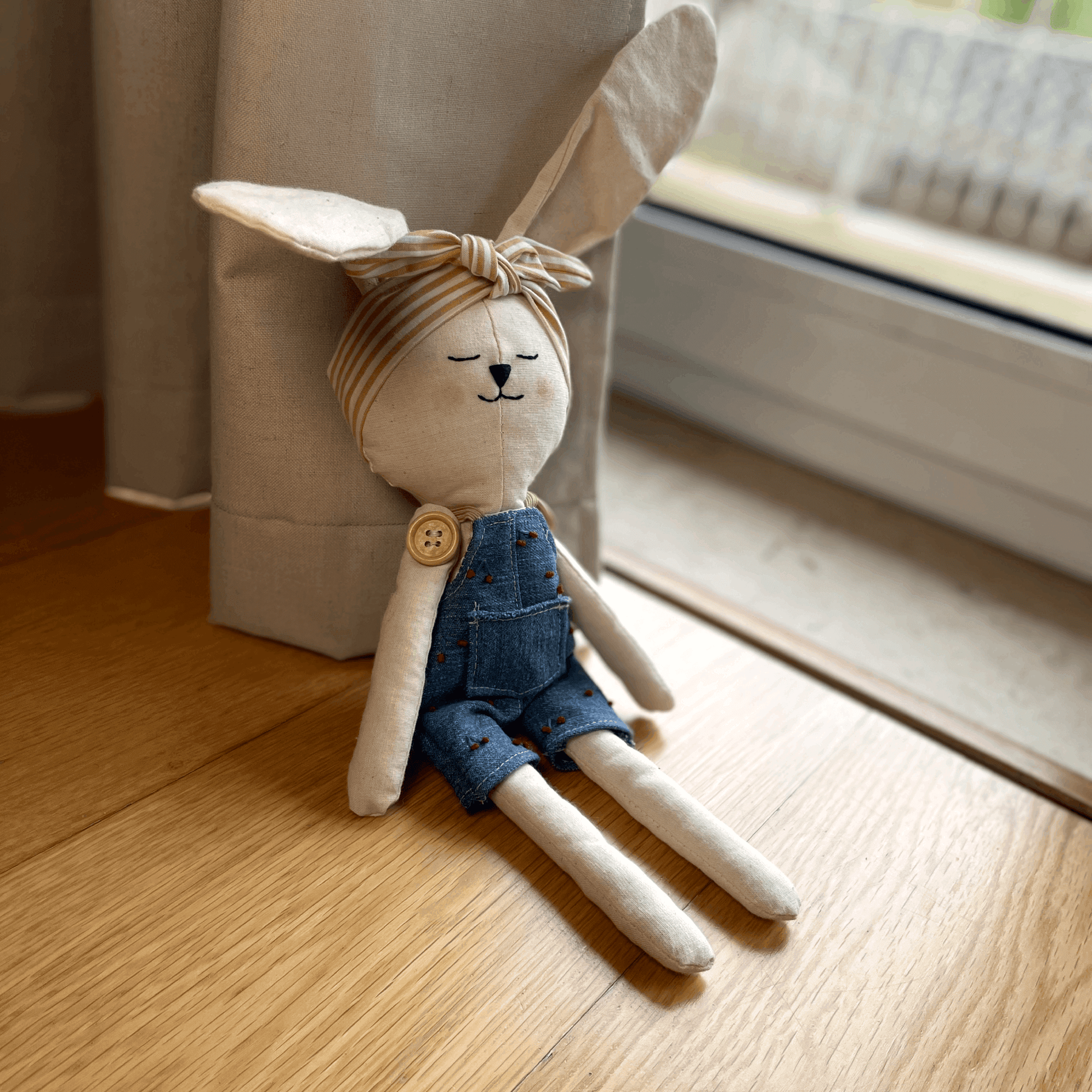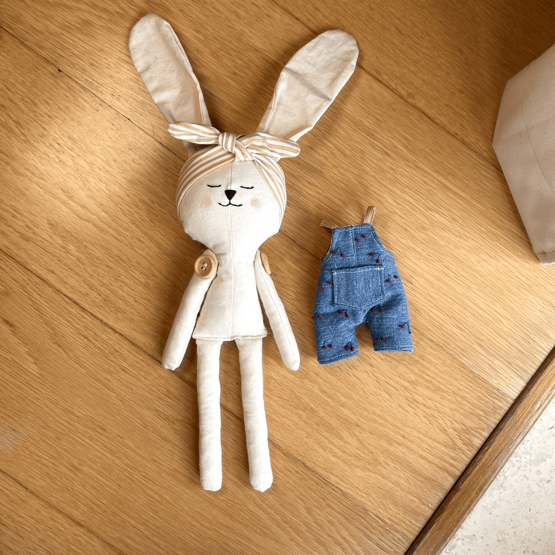 O seu corpo é feito em 100% algodão e o seu enchimento em poliester, com macacão de ganga e pormenores bordados à mão.