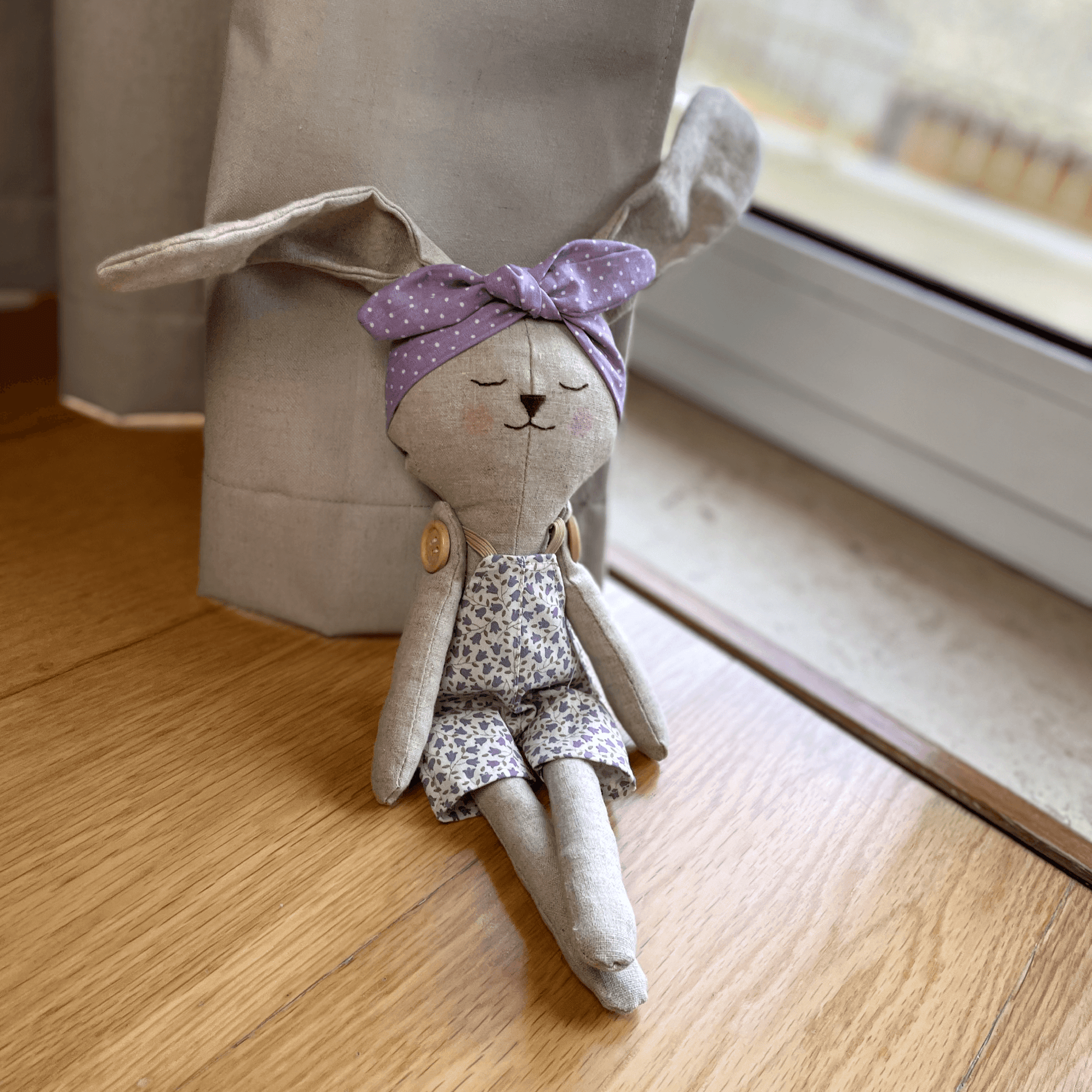O seu corpo é feito com tecido 50% linho 50% algodão e o seu enchimento em poliester, com roupas feitas em algodão e pormenores bordados à mão.
