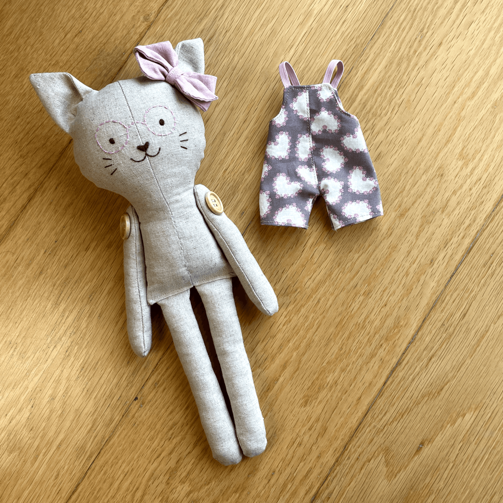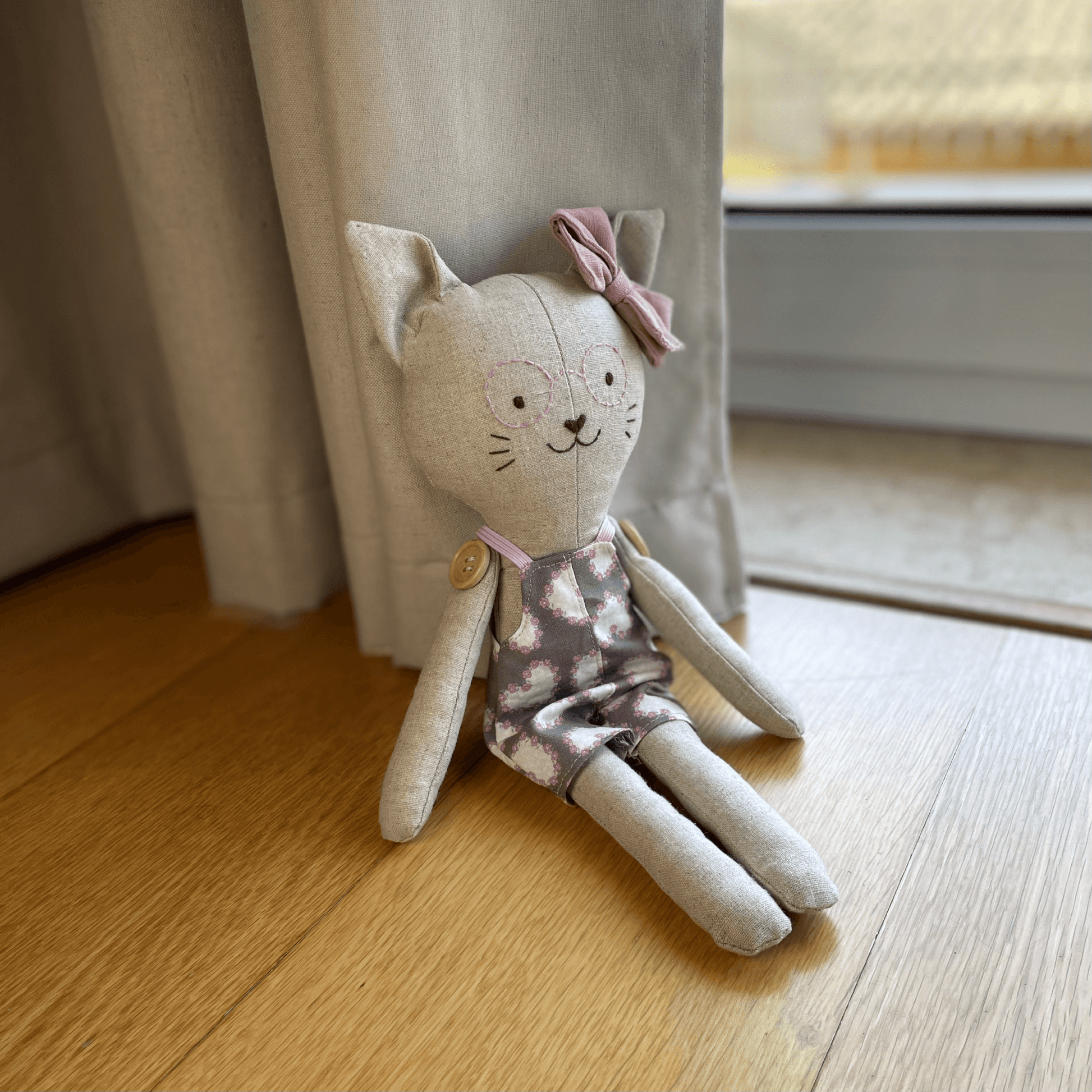 O seu corpo é feito com tecido 50% linho 50% algodão e o seu enchimento em poliester, com roupas feitas em algodão e pormenores bordados à mão.
