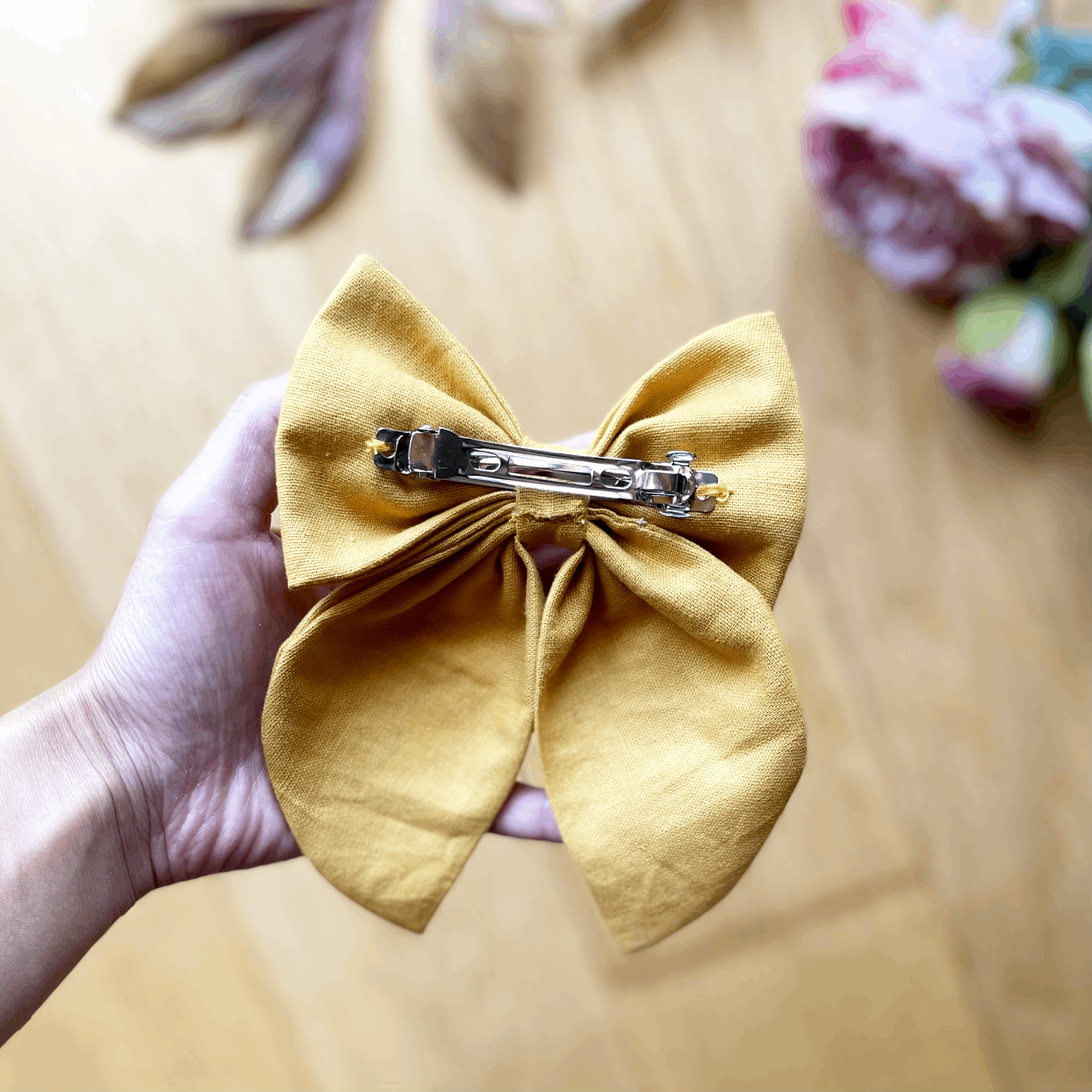 Laço em tecido 50% linho 50% algodão bordado à mão, mede aproximadamente 12 x 15 cm (comprimento x altura).