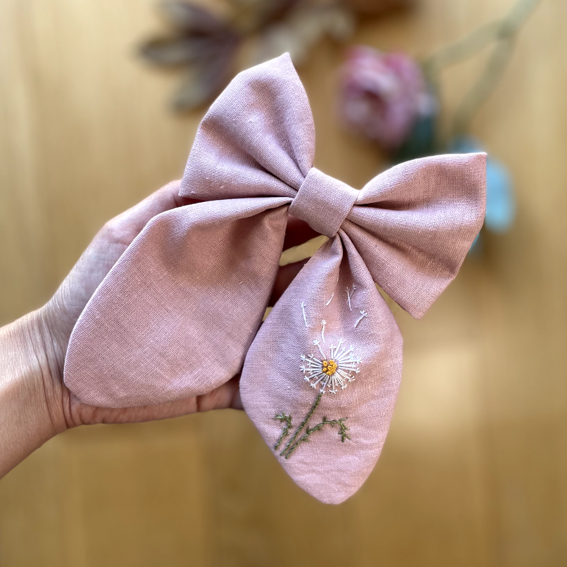 Laço em tecido 50% linho 50% algodão bordado à mão, mede aproximadamente 12 x 15 cm (comprimento x altura).